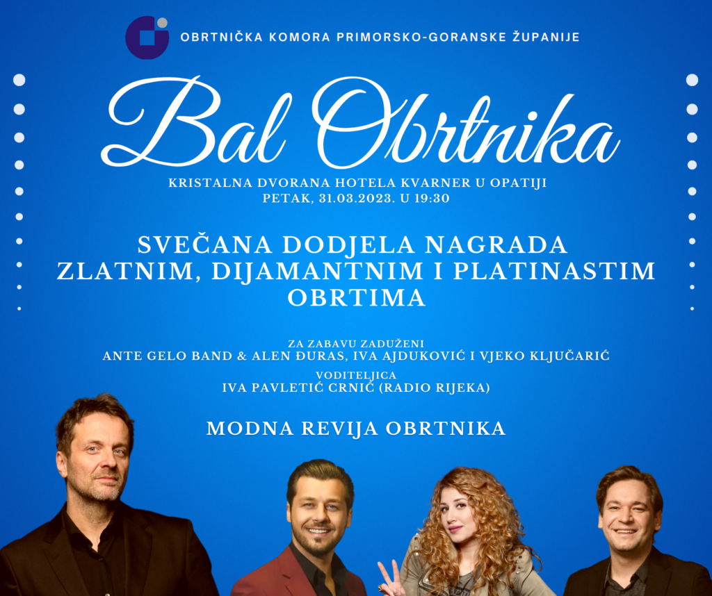 Iznimna nam je čast pozvati Vas na Bal obrtnika Obrtničke komore Primorsko-goranske županije koji će se održati dana 31. ožujka 2023. godine u Kristalnoj dvorani hotela Kvarner u Opatiji s početkom u 19:30 sati.