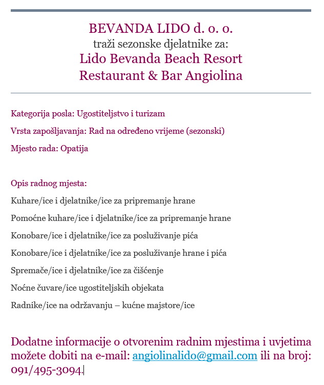 Radno mjesto: Konobari, kuhari, pomoćni djelatnici