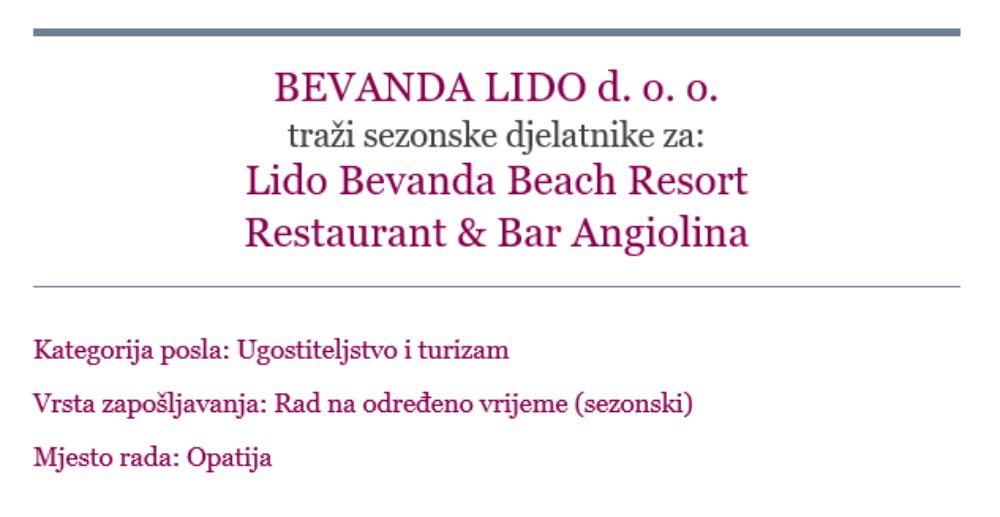 Radno mjesto: Konobari, kuhari, pomoćni djelatnici
