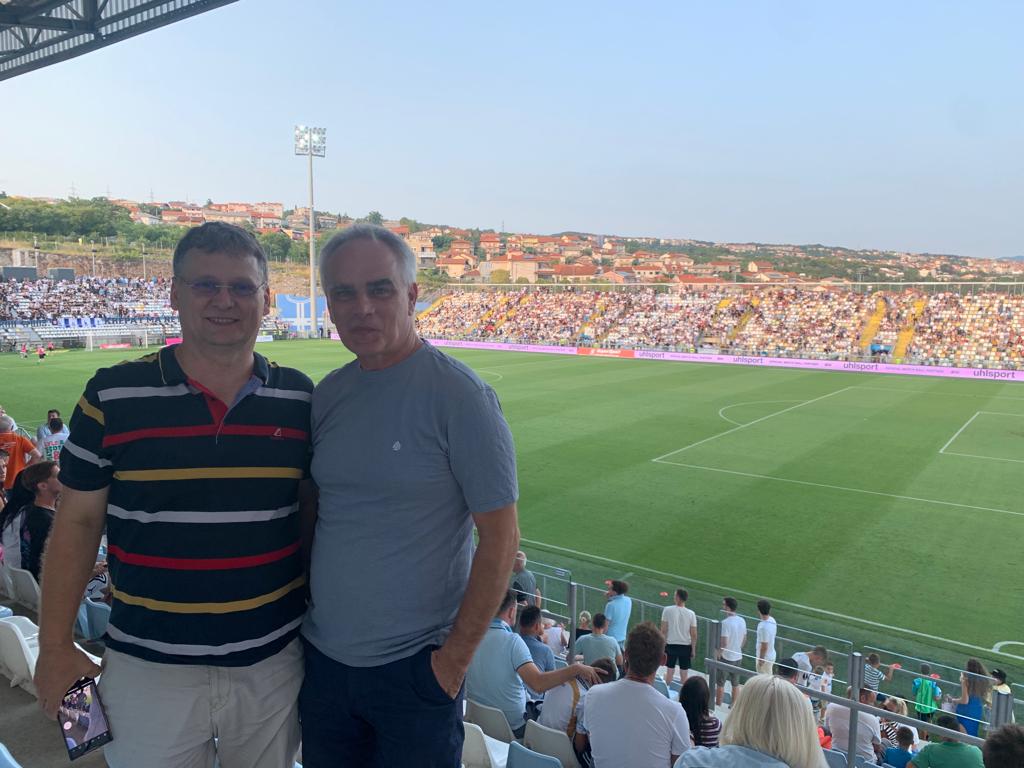 Nastavno na projekt “Zajedno” kojim je započela suradnja između NK Rijeka i Udruženja obrtnika Rijeka, predstavnici Udruženja obrtnika Rijeka prisustvovali su 22.7.2023. susretu prvog kola SuperSport HNL-a na Rujevici. Na fotografiji: predsjednik UO Rijeka Ivica Zbašnik i član Skupštine UO Rijeka Danijel Celcner.