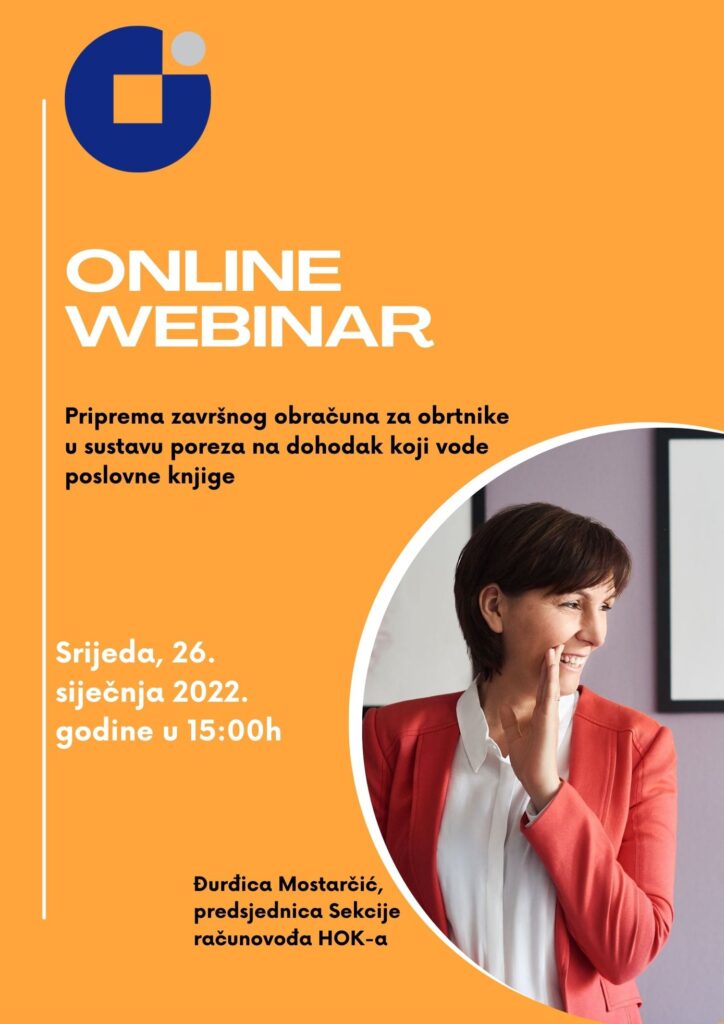 Pozivamo Vas na besplatni webinar o pripremi završnog obračuna za obrtnike u sustavu poreza na dohodak koji vode poslovne knjige. Webinar će održati predsjednica Sekcije računovođa Hrvatske obrtničke komore Đurđica Mostarčić.