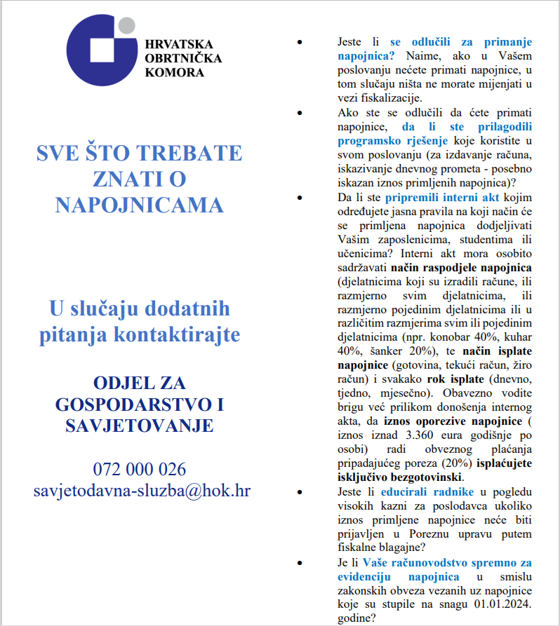 Hrvatska obrtnička komora, Odjel za gospodarstvo i savjetovanje pripremilo je dokument Odgovori na pitanja – Napojnice.