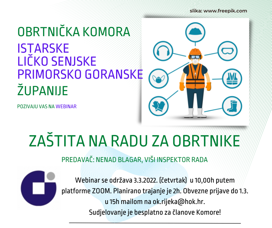 Pozivamo Vas da se prijavite na webinar s temom zaštite na radu za obrtnike, koji organiziramo 3.3.2022. godine u 10,00 sati putem platforme ZOOM. Predavač će biti viši inspektor Nenad Blagar.